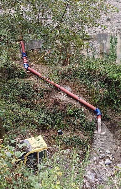 La pelle mécanique est équipée d'un marteau lui permettant de concasser la roche ! de fait elle creuse, en bordure du lit de la Malle, une tranchée dans laquelle sera enterré le tuyau.